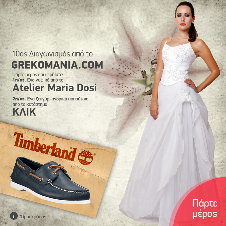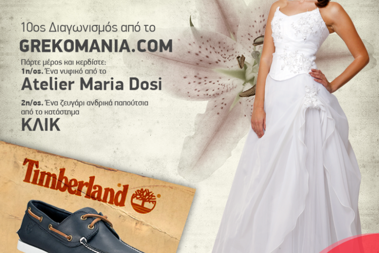 Το GREKOMANIA.COM διοργανώνει διαγωνισμό και σας δίνει τη δυνατότητα να κερδίσετε ένα νυφικό από το Atelier Maria Dosi & ένα ζευγάρι ανδρικά παπούτσια TIMBERLAND αξίας 149 ΕΥΡΩ.