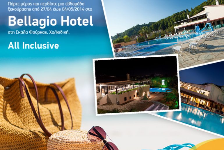 Η ηλεκτρονική σελίδα www.grekomania.com & www.grekomania.ru και το ξενοδοχείο Bellagio στην Σκάλα Φούρκας Χαλκιδική, σας προσφέρουν, μια εβδομάδα ξεκούρασης από 27/04 έως 04/05/2014 (All inclusive) για να κάνετε τις διακοπές σας.