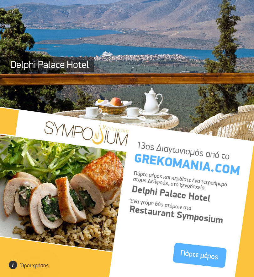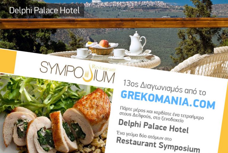 Το ξενοδοχείο Delphi palace και το Symposium Restaurant, μαζί με την Grekomania.com κάνουν τον 13ο διαγωνισμό μας ιδιαίτερο και μοναδικό. Από 01/05 έως 04/05/2014 ελάτε στους Δελφούς για 4 ημέρες αφήνοντας πίσω όλα σας τα προβλήματα και πάρτε χρησμό για μια νέα αρχή στην ζωή σας.