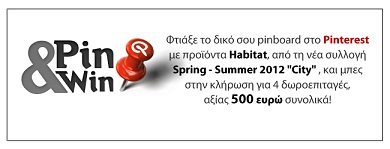 Η σελίδα Habitat Greece σας καλεί να δημιουργήσετε pinboard με όνομα “Habitat City Pin & Win”& να κάντε pin τα αγαπημένα σας προϊόντα από τη συλλογή Habitat City. Βάλτε στην περιγραφή τους το: #habitatcity. Συμπληρώσετε το link του “Habitat City Pin & Win” board σας στη σελίδα του διαγωνισμού και κερδίστε 4 δωροεπιταγές αξίας 500€ συνολικά.
