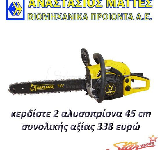 Το happystar.gr διοργανώνει διαγωνισμό και σας δίνει τη δυνατότητα να κερδίσετε 2 αλυσοπρίονα GARLAND από την Αναστάσιος Ματτές ΑΕ συνολικής αξίας 338 ευρώ!