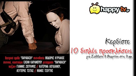 Το HappyTv.gr διοργανώνει διαγωνισμό και σας δίνει τη δυνατότητα να κερδίσετε 10 διπλές προσκλήσεις για το Σάββατο 9 Μαρτίου στις 9 :00μμ στην παράσταση «ΤΗΕ PILLOWMAN» στο Θέατρο «ΠΑΡΑΜΥΘΙΑΣ».