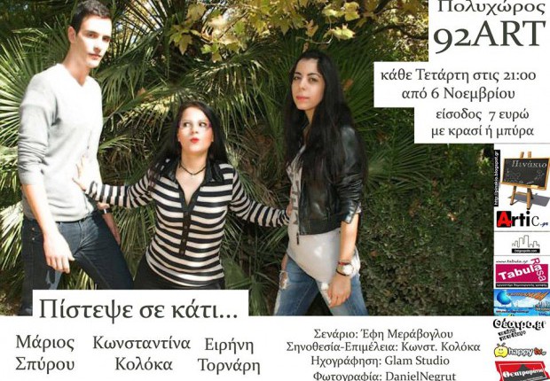 Το happytv.gr διοργανώνει διαγωνισμό και σας δίνει τη δυνατότητα να κερδίσετε μία διπλή πρόσκληση για την παράσταση «Πίστεψε σε κάτι…» στον πολυχώρο 92ART, για την Τετάρτη 13 Νοεμβρίου 2013 στις 9μμ.