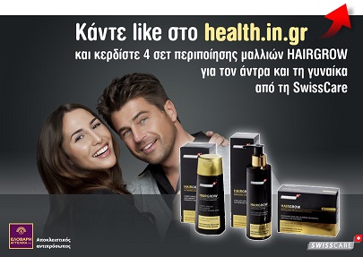 Tο health.in.gr σας προσκαλεί στο προφίλ του στο Facebook και σας δίνει τη δυνατότητα να κερδίσετε 4 σετ περιποίησης μαλλιών HAIRGROW, για τον άνδρα και τη γυναίκα, προσφορά της εταιρείας SwissCare, συνολικής αξίας 300 ευρώ.