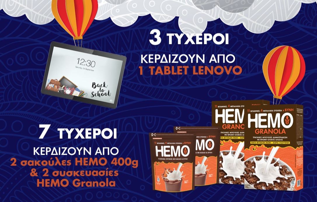 Το Hemo διοργανώνει διαγωνισμό και δίνει τη δυνατότητα σε 3 τυχερούς να κερδίσουν από ένα tablet Lenovo Tab M10 10’’ και σε ακόμη 7 τυχερούς από 2 σακούλες Hemo ρόφημα 400g και 2 Hemo Granola 400g!