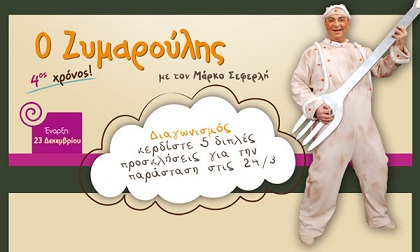 Το homefood.gr διοργανώνει διαγωνισμό και σας δίνει τη δυνατότητα να κερδίσετε 5 διπλές προσκλήσεις για την παιδική παράσταση  “Ο Ζυμαρούλης” με το Μάρκο Σεφερλή στις 24/3.