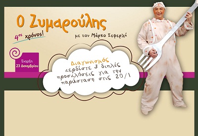Το homefood.gr διοργανώνει διαγωνισμό και σας δίνει τη δυνατότητα να κερδίσετε 3 διπλές προσκλήσεις για την παιδική παράσταση στις 20/1 “Ο Ζυμαρούλης” με το Μάρκο Σεφερλή.