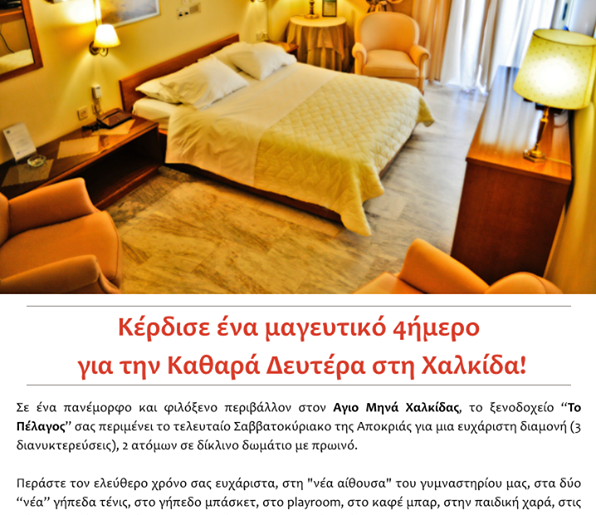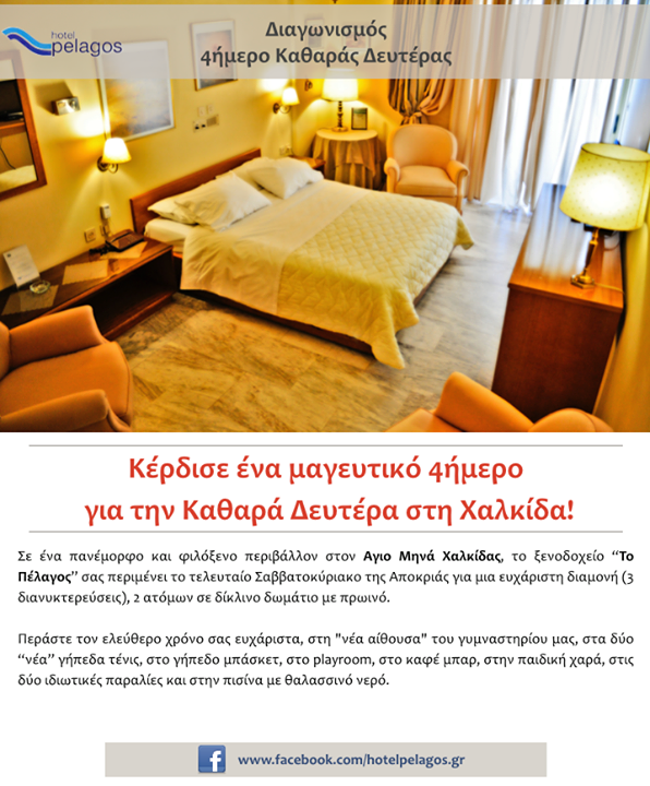 Το Hotel Pelagos διοργανώνει διαγωνισμό και σας δίνει τη δυνατότητα να κερδίσετε διαμονή το 4ήμερο (3 διανυκτερεύσεις) Αποκριών και Καθαράς Δευτέρας, στο πανέμορφο περιβάλλον του ξενοδοχείου στη Χαλκίδα για 2 άτομα σε δίκλινο δωμάτιο με πρωινό!