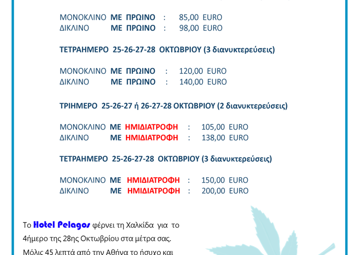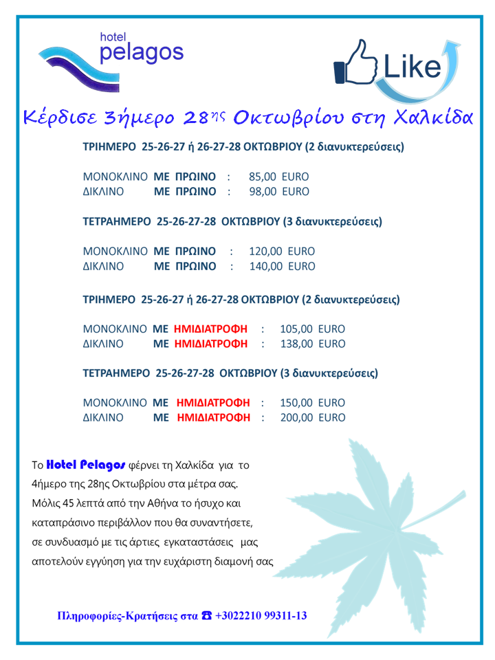 Το Hotel Pelagos διοργανώνει διαγωνισμό και σας δίνει τη δυνατότητα να κερδίσετε ένα 3ήμερο στο πανέμορφο περιβάλλον του ξενοδοχείου στη Χαλκίδα, για 2 άτομα σε δίκλινο δωμάτιο με πρωινό, επιλέγοντας μεταξύ 25-26-27 ή 26-27-28 Οκτωβρίου!