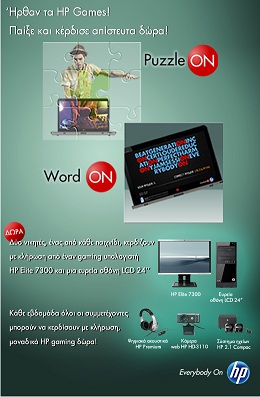 Η HP HELLAS σας προσκαλεί να παίξετε στα HP Game On παιχνίδα και να κερδίσετε απίστευτα HP gaming δώρα: 2 υπολογιστές HP 7300 microtower + δύο HP οθόνες LCD 24” compaq, 2 Ακουστικά HP Premium, 2 HP Webcam HD 3110 και 2 ΗΡ Σύστημα ηχείων 2.1 compact.