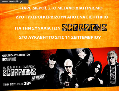 Ο i feel radio διοργανώνει διαγωνισμό και σας προσφέρει δύο εισιτήρια για την συναυλία των Scorpions στις 11 Σεπτεμβρίου 2013 στο Λυκαβηττό!