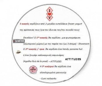 Τα δώρα του Διαγωνισμού που θα κερδίσουν 3 τυχεροί είναι τα εξής: 3 νικητές κερδίζουν από 2 μεγάλα κυπελλάκια frozen yogurt της αρέσκειάς τους (για τον ίδιο και τον/την συνοδό τους) Eπιπλέον! Ο 1ος νικητής θα κερδίσει μια φωτογράφιση (εξωτερικούχώρου) με την παρέα του (ως 3 άτομα) – Showroom. Ο 2ος νικητής θα κερδίσει ένα trendy panama hut ή ένα ζευγάρι καλοκαιρινές σαγιονάρες (Agatha Ruiz de la prad) – AΤΤΙΤUDES. ) 3ος νικητής θα κερδίσει ένα ολοκληρωμένο μανικιούρ – Cure nailworks