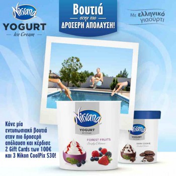 Ανεβάστε τη φωτογραφία σας, βουτήξτε στο NIRVANA Yogurt Forest Fruits ή στο NIRVANA Yogurt Dark Cookies και διεκδικήστε 2 gift cards αξίας 100€ και 3 αδιάβροχες φωτογραφικές μηχανές Canon Coolpix S30.