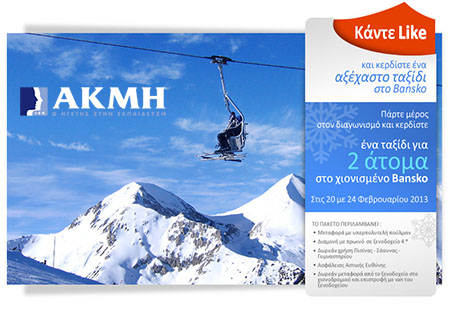 Το ΙΕΚ ΑΚΜΗ διοργανώνει διαγωνισμό και σας δίνει τη δυνατότητα να κερδίσετε ένα αξέχαστο ταξίδι για 2 άτομα στο χιονισμένο Bansko, στις 20 με 24 Φεβρουαρίου 2013.