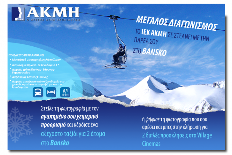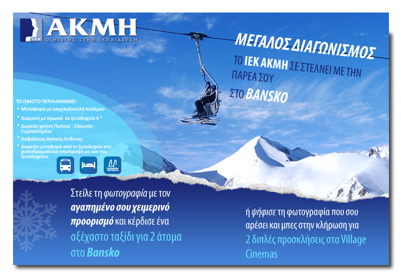 Πάρε και εσύ μέρος στο Διαγωνισμό Φωτογραφίας του ΙΕΚ ΑΚΜΗ “Ο αγαπημένος μου χειμερινός προορισμός” και κέρδισε ένα ταξίδι για 2 στο Bansko (30/01-02/02/2014) και 2 διπλές προσκλήσεις για τα Village Cinemas.