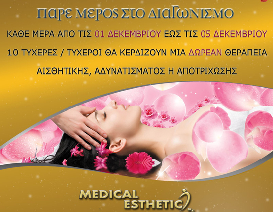 Το ifeelradio.gr διοργανώνει διαγωνισμό και δίνει τη δυνατότητα κάθε μέρα από τις 2 Δεκεμβρίου έως τις 5 Δεκεμβρίου σε 10 τυχερές / τυχερούς να κερδίσουν μια δωρεάν θεραπεία Αισθητικής, Αδυνατίσματος ή Αποτρίχωσης.