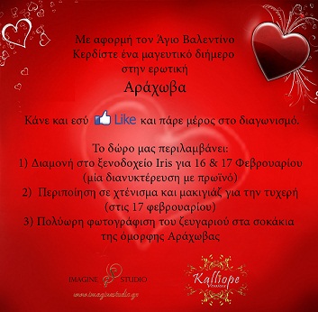 Το Imagine Studio διοργανώνει διαγωνισμό και σας δίνει τη δυνατότητα να κερδίσετε ένα μαγευτικό διήμερο στην Αράχωβα που περιλαμβάνει διαμονή στο ξενοδοχείο Iris για 16 & 17 Φεβρουαρίου (μία διανυκτέρευση με πρωινό), περιποίηση σε χτένισμα και μακιγιάζ για την τυχερή (στις 17 Φεβρουαρίου) και πολύωρη φωτογράφιση του ζευγαριού στα σοκάκια της όμορφης Αράχωβας.