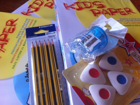 Κάθε σετ γραφικής ύλης αποτελείται από 1 πακέτο με φωτοτυπικό χαρτί- χαρτί ζωγραφικής, μια ξύστρα, δύο μολύβια και μια γόμα.