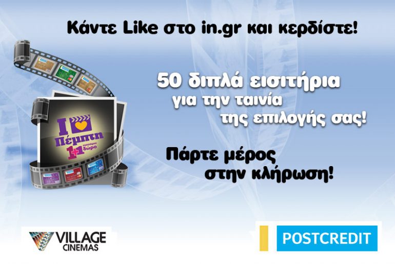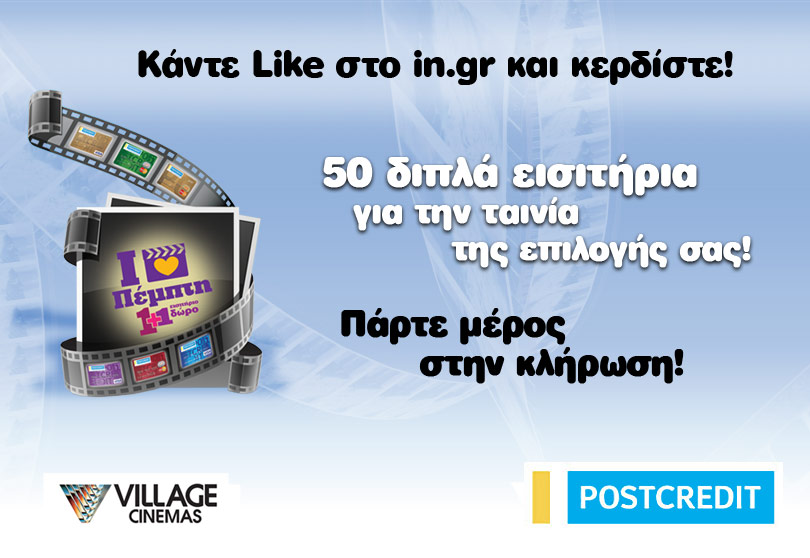 Νέος διαγωνισμός!! Η συμμετοχή σας στον προηγούμενο διαγωνισμό μάς ώθησε να συνεχίσουμε κληρώνοντας 50 ακόμη εισιτήρια για τα Village! Το in.gr σε συνεργασία με την POSTCREDIT προσφέρει σε 50 ακόμη τυχερούς, από ένα διπλό εισιτήριο για να παρακολουθήσουν τις αγαπημένες τους ταινίες στα Village Cinemas, όποτε οι ίδιοι επιθυμούν, έως τις 31/12/2013.