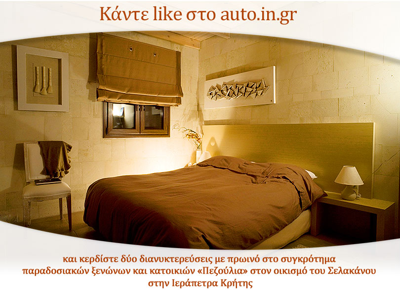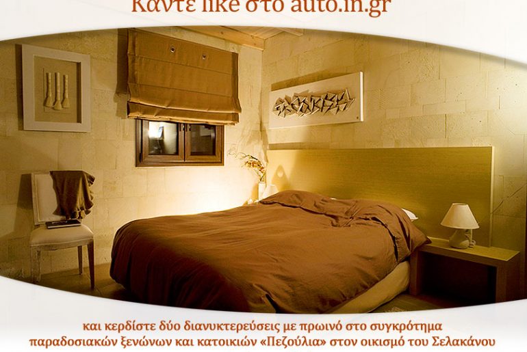 Το auto.in.gr, σε συνεργασία με το συγκρότημα παραδοσιακών κατοικιών Πεζούλια στον οικισμό Σελάκανο Ιεράπετρας, προσφέρει σε έναν τυχερό αναγνώστη (ή μία τυχερή αναγνώστρια) 2 διανυκτερεύσεις με πρωινό στο προαναφερθέν τουριστικό κατάλυμα.