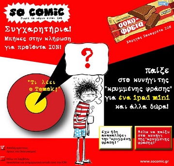 Η σελίδα ION Sokofreta διοργανώνει διαγωνισμό και δίνει τη δυνατότητα σε σε 1 τυχερό να κερδίσει προϊόντα ΙΟΝ, Comics και το νέο mini iPad, σε 3 τυχερούς να κερδίσουν προϊόντα ΙΟΝ & Comics & Lomo φωτογραφικές μηχανές και σε 11 τυχερούς να κερδίσουν προϊόντα ΙΟΝ & Comics.