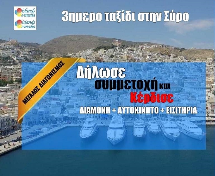 Η Islands e-media διοργανώνει διαγωνισμό και σας δίνει τη δυνατότητα να κερδίσετε ένα μοναδικό 3ήμερο με διαμονή, αυτοκίνητο για δύο ημέρες και εισιτήρια δύο ατόμων με επιστροφή στη Σύρο!