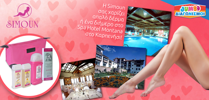Τα Jumbo διοργανώνουν διαγωνισμό και δίνουν τη δυνατότητα σε 20 τυχερούς να κερδίσουν από ένα νεσεσέρ γεμάτο προϊόντα αποτρίχωσης, αξίας €23 και σε 1 μεγάλο νικητή, δύο διανυκτερεύσεις σε σουίτα του ξενοδοχείου 5 αστέρων Spa Hotel Montana, στο Καρπενήσι, με ημιδιατροφή, σάουνα, χαμάμ και χρήση θερμαινόμενης πισίνας, αξίας €700, για το διήμερο του Αγίου Βαλεντίνου!