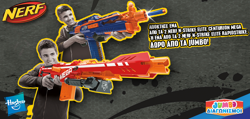 Το Jumbo διοργανώνει διαγωνισμό και σας δίνει τη δυνατότητα να κερδίσετε 2 εκτοξευτές NERF N-STRIKE ELITE CENTURION MEGA, αξίας €59,99, με αναδιπλούμενο δίποδο και ΜΕGA Darts για MEGA αποστάσεις ή 2 αυτόματους NERF N-STRIKE ELITE RAPIDSTRIKE, αξίας €49,99, για ταχύτερη εκτόξευση 4 Darts ανά δευτερόλεπτο!