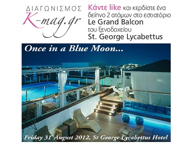 Το online μαγκαζίνο The K-magazine και το ξενοδοχείο St. George Lycabettus διοργανώνει διαγωνισμό και σας δίνει τη δυνατότητα να κερδίσετε ένα γκουρμέ δείπνο 5 πιάτων (με κρασί), για 2 άτομα στο εστιατόριο Le Grand Balcon για την Παρασκευή 31 Αυγούστου, με αφορμή την μπλε πανσέληνο.