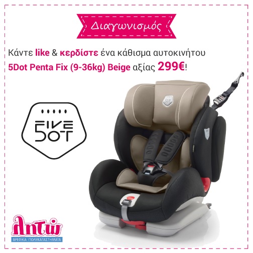 Το Λητώ διοργανώνει διαγωνισμό και σας δίνει τη δυνατότητα να κερδίσετε ένα κάθισμα αυτοκινήτου 5Dot Penta Fix (9-36kg) σε χρώμα Beige, αξίας 299€, για αξεπέραστη άνεση και ασφάλεια σε κάθε μικρή ή μεγάλη διαδρομή!