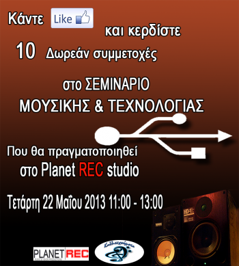 Η εταιρία Καλλιτεχνήματα διοργανώνει διαγωνισμό και σας δίνει τη δυνατότητα να κερδίσετε 10 δωρεάν συμμετοχές στο σεμινάριο Μουσικής & Τεχνολογίας που θα πραγματοποιηθεί στο Planet REC studio..