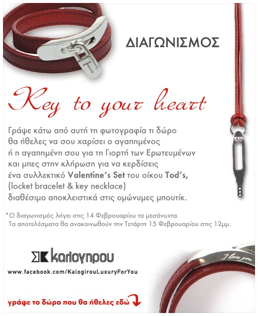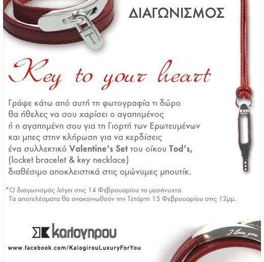 Η σελίδα Καλογήρου διοργανώνει το διαγωνισμό “Key to your heart” και σας δίνει τη δυνατότητα να κερδίσετε ένα Valentine’s Set του οίκου Tod’s.