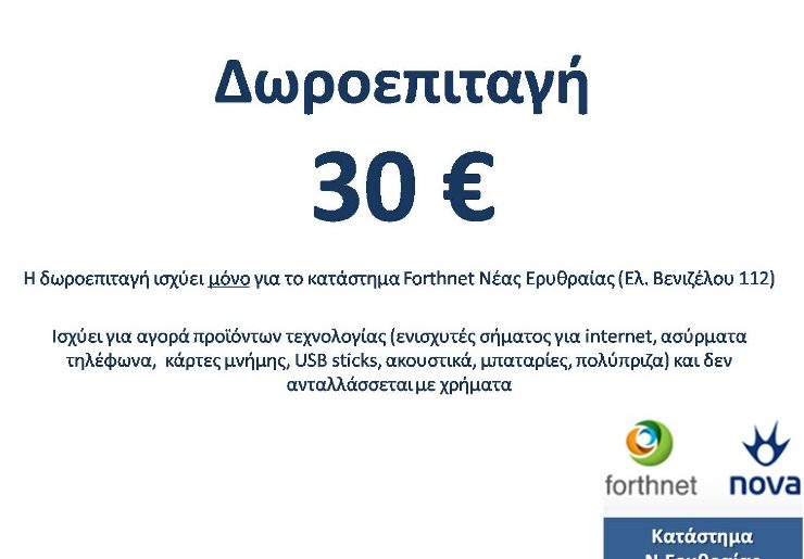 Το Κατάστημα Forthnet Νέας Ερυθραίας διοργανώνει διαγωνισμό και σας δίνει τη δυνατότητα να κερδίσετε δωροεπιταγή 30 ευρώ για αγορά προϊόντων τεχνολογίας (ενισχυτές σήματος Internet, κάρτες μνήμης, ασύρματα τηλέφωνα, USB sticks, πολύ πριζα, μπαταρίες) από το κατάστημα.