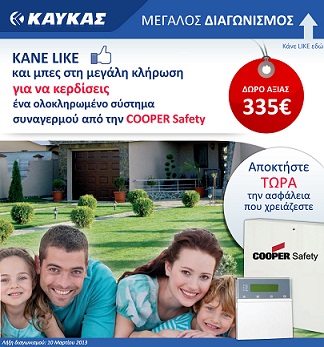 Η σελίδα ΚΑΥΚΑΣ Ηλεκτρολογικό υλικό & φωτισμός διοργανώνει διαγωνισμό και σας δίνει τη δυνατότητα να κερδίσετε ένα ολοκληρωμένο σύστημα ενσύρματου συναγερμού της COOPER SAFETY αξίας 335€.