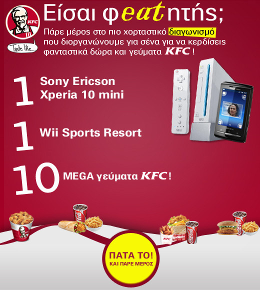 Είσαι φeatητής; Πάρε μέρος στο πιο χορταστικό διαγωνισμό που διοργανώνουν τα KFC στο Facebook για να κερδίσεις φανταστικά δώρα και γεύματα στα KFC! Πιο συγκεκριμένα, τα δώρα του διαγωνισμού είναι: