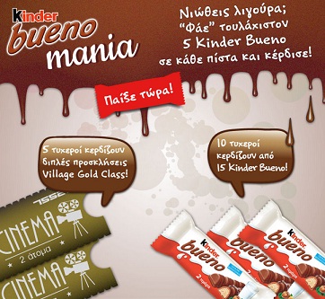 Το Κinder Bueno διοργανώνει το διαγωνισμό “Kinderbuenomania” και σας προσκαλεί να παίξετε και να κερδίσετε μοναδικά δώρα. 5 τυχεροί θα κερδίσουν διπλές προσκλήσεις για τα Village Cinemas Gold Class και 10 τυχεροί από 15 τεμάχια Kinder Bueno.