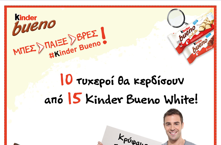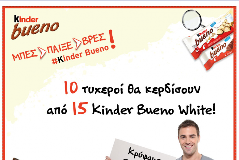 To Kinder Bueno διοργανώνει διαγωνισμό και προσφέρει σε 10 τυχερούς από 15 Kinder Bueno White. Μπες, παίξε και βρες τις κρυμμένες λέξεις στο διαγωνισμό του Kinder Bueno στο Facebook.