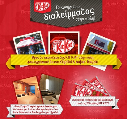 Το κυνήγι του χαμένου διαλείμματος στην πόλη μόλις ξεκίνησε! Εντόπισε τα περίπτερα που είναι ντυμένα Kit Kat στην Αθήνα, βγάλε τα φωτογραφία, και ανέβασε τις φωτογραφίες σου. Βρες 1 περίπτερο και διεκδίκησε 1 από τις 20 κούτες Kit Kat. Βρες 2 περίπτερα και διεκδίκησε μια διαμονή, ένα massage και ένα δείπνο για 2 άτομα στο Astir Palace Βουλιαγμένης!