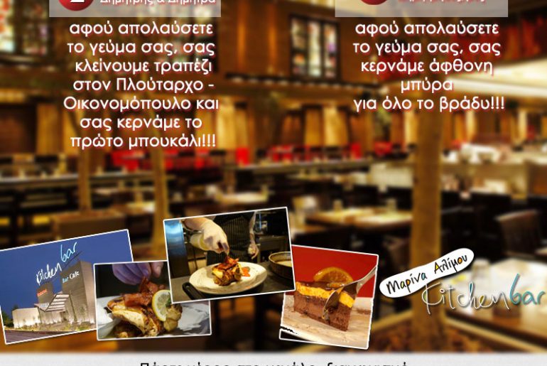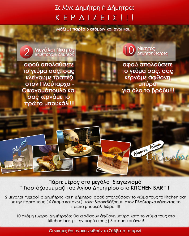 Πάρτε μέρος στο μεγάλο διαγωνισμό ” Γιορτάζουμε μαζί του Αγίου Δημητρίου στο KITCHEN BAR “! 2 μεγάλοι τυχεροί ο Δημήτρης και η Δήμητρα αφού απολαύσουν το γεύμα τους το kitchen bar με την παρέα τους (6 άτομα και άνω) τους διασκεδάζουμε στον ΠΛΟΥΤΑΡΧΟ – ΟΙΚΟΝΟΜΟΠΟΥΛΟ / ΘΕΑ live κάνοντας δώρο ένα μπουκάλι ουίσκι! 10 ακόμη τυχεροί Δημήτρηδες θα κερδίσουν άφθονη μπύρα κατά το γεύμα τους στο kitchen bar με την παρέα τους (6 άτομα και άνω)!