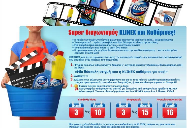 Το klinex.gr διοργανώνει διαγωνισμό και δίνει τη δυνατότητα σε έναν τυχερό να κερδίσει καθαρισμό του σπιτιού του για ένα χρόνο από συνεργείο με προϊόντα KLINEX και σε δέκα ακόμα τυχερούς να κερδίσουν από ένα σετ αξεσουάρ μπάνιου και ένα KLINEX spray 4 σε 1 Μπάνιο 750ml.