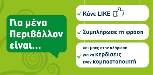 Συμπληρώστε τη φράση “Για μένα περιβάλλον είναι…” κάντε like στη σελίδα ΔΙΚΤΥΟ ΕΝΕΡΓΩΝ ΠΟΛΙΤΩΝ και μπαίνετε στην κλήρωση για έναν οικιακό κομποστοποιητή μπαλκονιού αξίας 120 ευρώ.