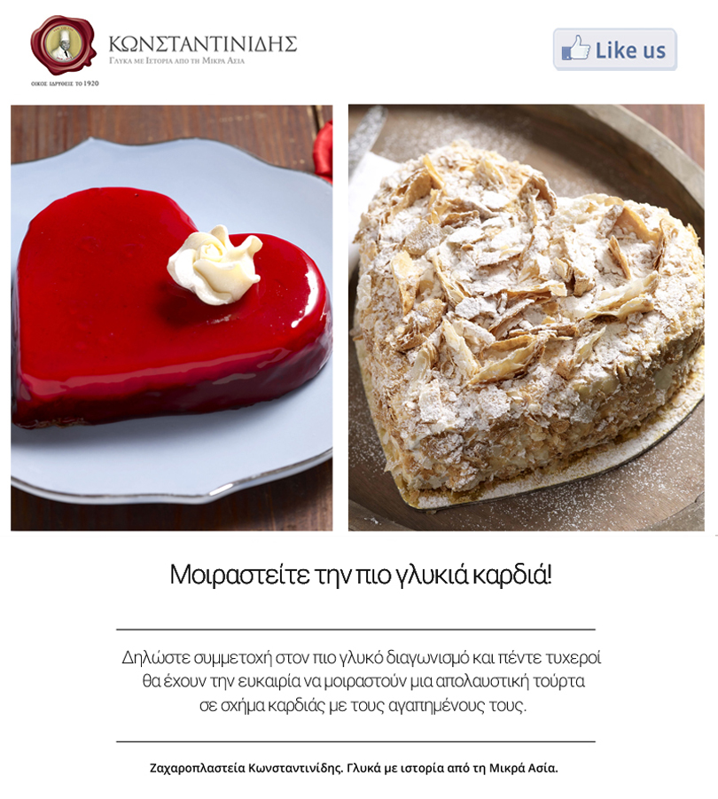Ο konstandinidis.com διοργανώνει διαγωνισμό και σας δίνει τη δυνατότητα να κερδίσετε μια απολαυστική τούρτα σε σχήμα καρδιάς .