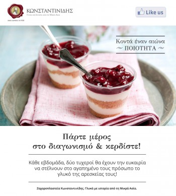 Τα Ζαχαροπλαστεία Κωνσταντινίδης διοργανώνουν διαγωνισμό και δίνουν τη δυνατότητα σε 2 τυχερούς κάθε εβδομάδα να στείλουν στο αγαπημένο τους πρόσωπο το γλυκό της αρεσκείας τους.