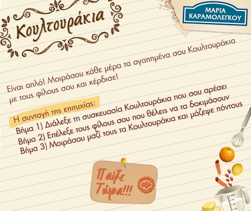 Τα κουλουράκια Κουλτουράκια διοργανώνουν διαγωνισμό στη σελίδα τους στο facebook και σας δίνουν τη δυνατότητα να κερδίσετε μια κούτα κουλτουράκια.