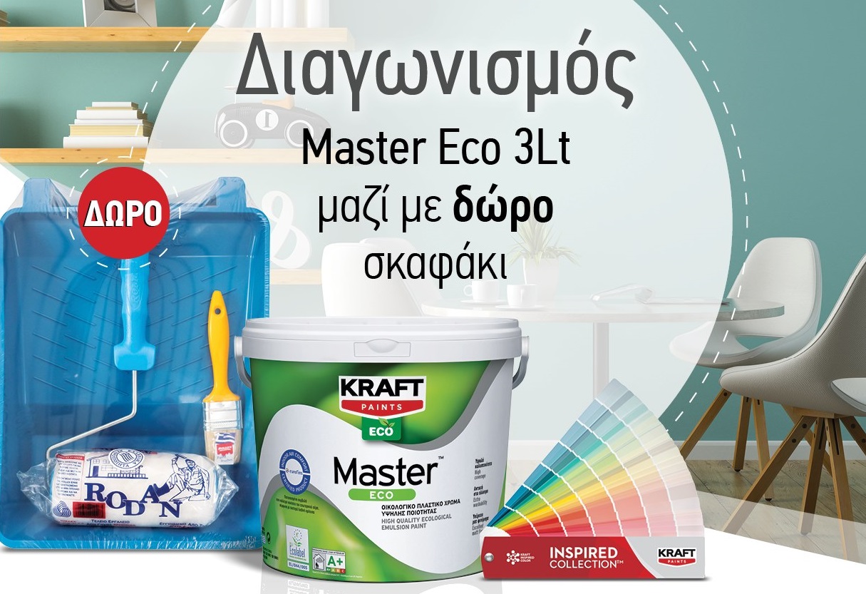 H Kraft Paints Greece διοργανώνει διαγωνισμό και δίνει τη δυνατότητα σε 5 τυχερούς να κερδίσουν από ένα δοχείο Master Eco 3Lt σε απόχρωση της επιλογής τους, μαζί με ένα σετ εργαλείων βαφής της Rollex (σκαφάκι, ρολό και πινέλο)!