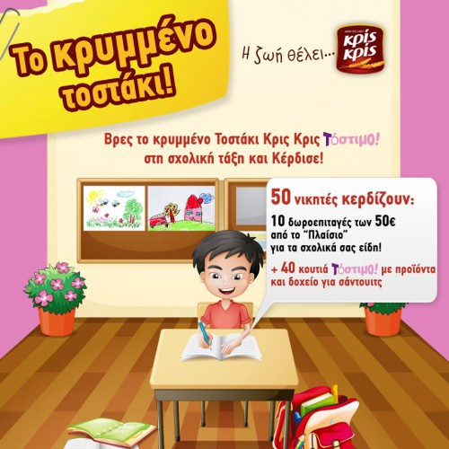 Η σελίδα Κρις Κρις διοργανώνει διαγωνισμό και σας δίνει τη δυνατότητα να κερδίσετε 50 δωροεπιταγές από το «Πλαίσιο», αξίας 50€ και 40 κουτιά “Τόστιμο!” με προϊόντα και δοχείο για σάντουιτς.