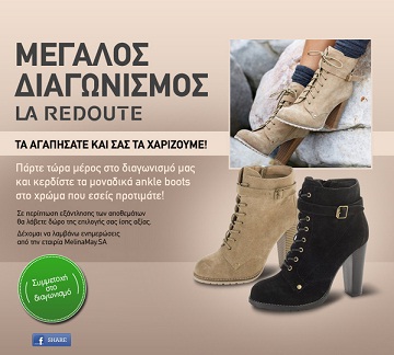 Η La Redoute διοργανώνει διαγωνισμό και σας δίνει τη δυνατότητα να κερδίσετε τα μοναδικά ankle boots στο χρώμα που προτιμάτε.