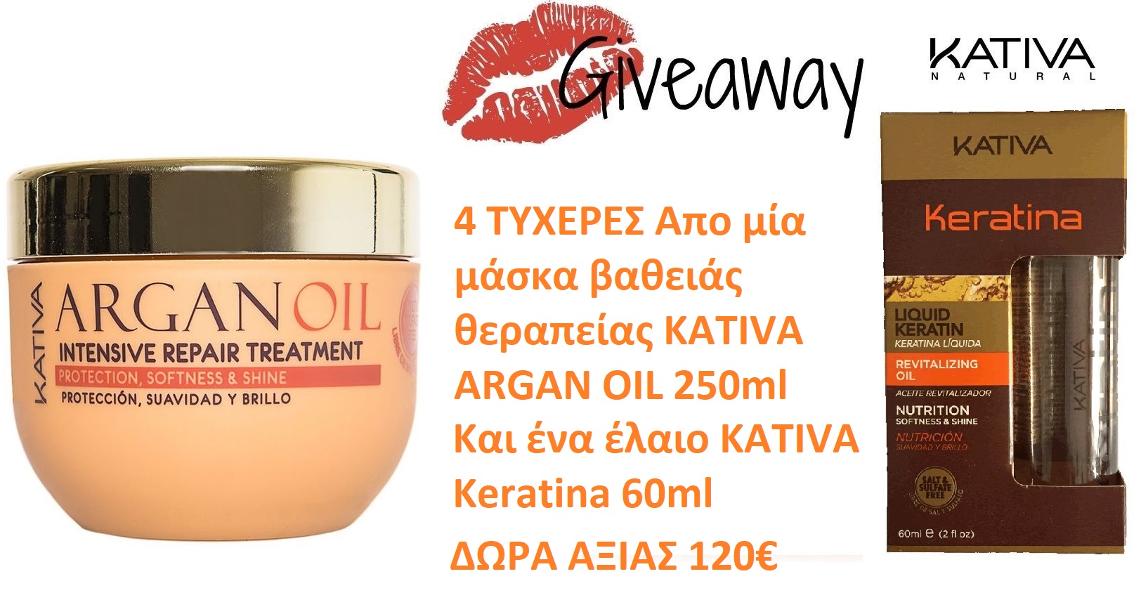 Το La Rou Hair Cosmetics διοργανώνει διαγωνισμό και σας δίνει τη δυνατότητα να κερδίσετε απο μία μάσκα βαθιάς θεραπείας KATIVA Argan Oil Deep Treatment 250ml και Έλαιο Κερατίνης KATIVA Keratina 60ml! Τέσσερις θα είναι οι τυχερές. Δώρα Αξίας 120€