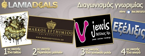 Το lamiadeals.gr διοργανώνει διαγωνισμό και σας δίνει τη δυνατότητα να κερδίσετε ένα tattoo της επιλογής σας αξίας 150€, μια θεραπεία botox με χρυσό και κερατίνη με φορμάρισμα μαλλιών αξίας 30€, ένα γυναικείο ρολόι Ed hardy watches αξίας 80€ και ένα κινητό τηλέφωνο Sony wt13i αξίας 110€.