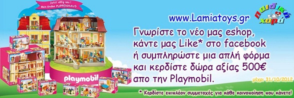 To κατάστημα Παιδική χαρά χαρίζει σε 2 τυχερούς επισκέπτες της ιστοσελίδας του lamiatoys.gr, 2 δώρα PLAYMOBIL αξίας 500€.